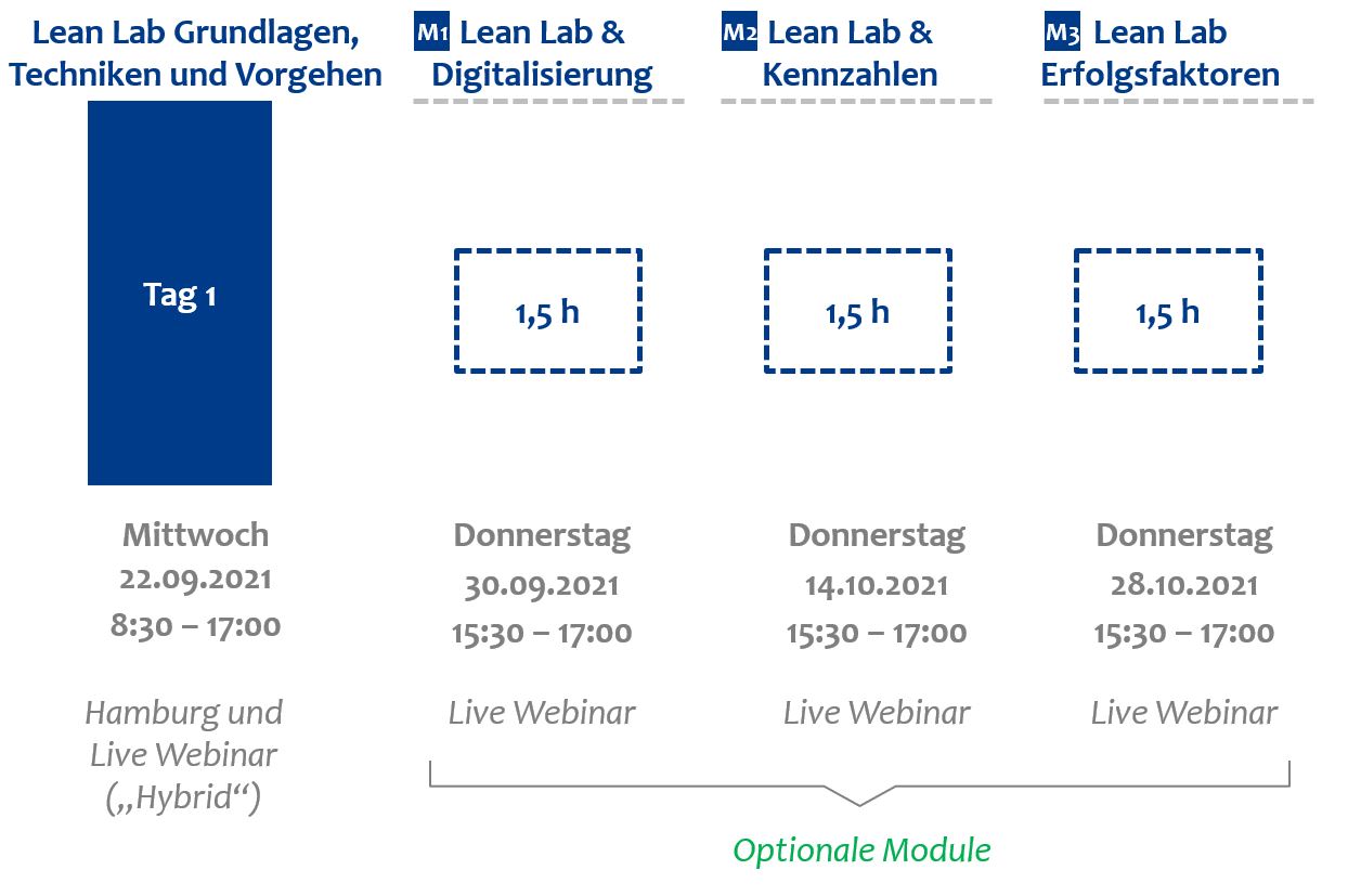 Die Schulung besteht aus einem Tag zu den Grundlagen und Techniken von Lean Lab sowie zum Vorgehen der Einführung, welcher voraussichtlich als Hybrid-Veranstaltung angeboten wird, d.h. sowohl als Veranstaltung vor Ort in Hamburg als auch per Live-Webinar. Die ergänzenden Module per Live-Webinar M1, M2 und M3 können je nach Interesse hinzugebucht werden, d.h. sind optional.